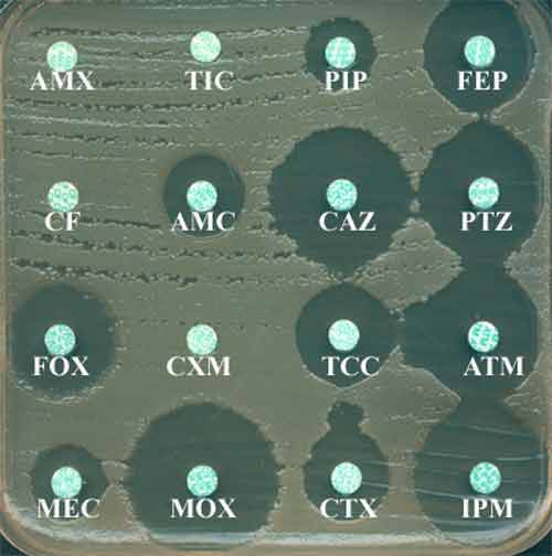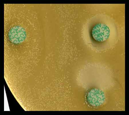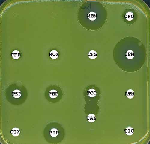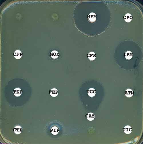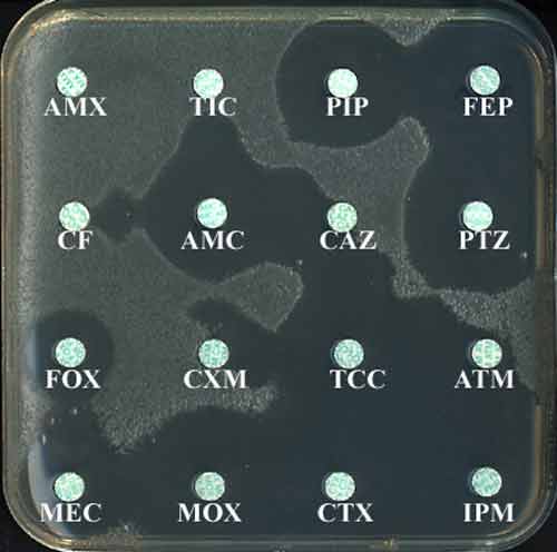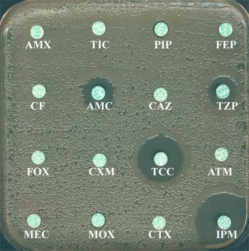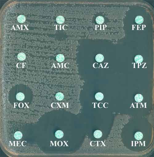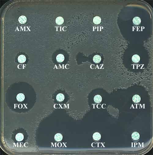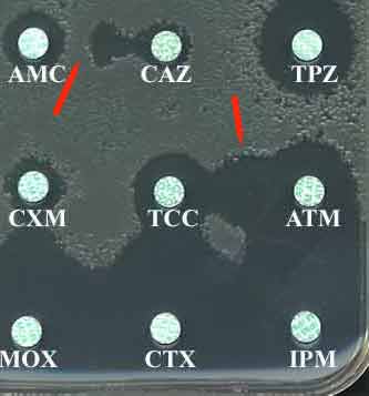 - Pour les enzymes mutées appartenant à la classe D (oxacillinases) rencontrées surtout chez les souches de P. aeruginosa (http://www.lahey.org/Studies/), la résistance à la ceftazidime n'est pas souvent corrélée avec une synergie en présence d'un disque contenant de l'acide clavulanique. Seule l'approche moléculaire permettra une identification précise de la ß-lactamase en cause. |