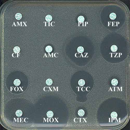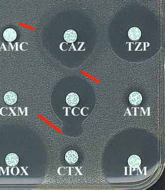 Pour la comparaison, vous pouvez revoir les phénotypes sauvages de ces espèces ci-dessus: Pour en savoir plus pour les mutations: http://www.lahey.org/Studies/ - Pour les enzymes appartenant à la classe A et pour une souche d'entérobactérie, les phénotypes sont de type céfotaximase (CTX) ou ceftazidimase (CAZ) et une excellente synergie est observée entre le céfotaxime (CTX) et/ou la cefttazidime (CAZ) et/ou encore l'aztréonam (ATM) et un disque contenant de l'acide clavulanique tels AMC (+ amoxiclline) ou TCC (+ ticarcilline). - Pour les enzymes appartenant à la classe A chez P. aeruginosa ou A. baumannii, la détection de la synergie est plus difficile en raison d'associations avec d'autres mécanismes de résistance tel hyperproduction de céphalosporinase et peut demander des conditions particulières : 1/ Rapprochement des disques Exemple de PER-1 chez P. aeruginosa