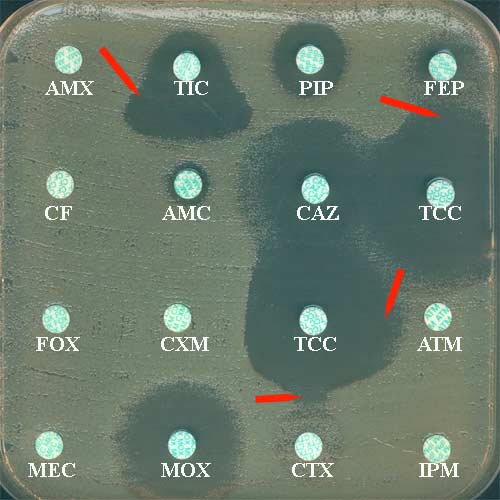 - Divers facteurs peuvent amener à un test de synergie négatif tels : - En dehors d'une entérobactérie, l'existence d'un test de synergie positif doit être, là encore, analysée par rapport à l'espèce identifiée. Car nombre d'espèces sont naturellement productrices , voire hyperproductrices de leurs ß-lactamases chromosomiques de classe A aptes à inactiver certaines C3G/monobactam telles L2 (Stenotrophomonas maltophilia), CME (C. meningosepticum)..... Quelques exemples de synergie sont indiquées ci-dessous (cf flèche rouge):