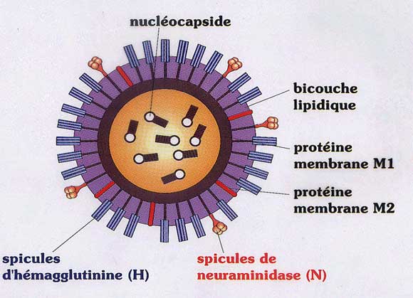 - Les virus de la grippe ont une enveloppe dérivée de la membrane cytoplasmique. L’enveloppe porte deux sortes de spicules, qui sont des glycoprotéines virales : les spicules d'hémagglutinine, en abrégé HA, et des spicules de neuraminidase, en abrégé NA. Ce sont des antigènes viraux. Ces structures jouent un rôle dans la multiplication virale. L'hémagglutinine, au niveau de l'attachement du virus sur la membrane cytoplasmique des cellules à infecter et au niveau de la fusion de l’enveloppe à la membrane cytoplasmique. La neuramidase joue un rôle au moment du détachement des bourgeons lors de la formation des nouveaux virus et d'autre part elle lyse le mucus bronchique qui a des propriétés antivirales. On décrit plusieurs sous types d’HA ou de NA selon les virus, à ce jour 15 sous types d’HA et 9 sous types de NA sont connus.