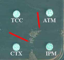 Ce phénotype de résistance est liée à la synthèse d'une ß-lactamase chromosomique de classe C ou CASE (1er gène identifié de type ACC-1) qui est résistant à l'acide clavulanique (pas de synergie). Le gène AmpC est régulé, d'où une expression inductible, c'est-à-dire augmentée en présence d'une molécule inductrice telle l'imipénème (IPM)(antagonisme visible, cf flèche rouge). Chez cette espèce, l'expression de la résistance vis-à-vis de la céfoxitine (FOX) est nulle.