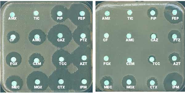 3-1-3 Voici en 1996, un antibiogramme obtenu à partir d'une souche clinique de Klebsiella pneumoniae de phénotype "céphalosporinase inductible" (bien regarder entre ATM et IPM), donc a priori il s'agissait d'un phénotype impossible détecté, en particulier par la résistance aux C3G dont la ceftazidime (CAZ) en l'absence de synergie avec l'association de l'amoxicilline + acide clavulanique (AMC). Une telle éventualité, impossible jusqu'alors, exigeait d'abord de confirmer l'identification bactérienne (phénotype impossible ou inconnu), puis d'identifier ce nouveau mécanisme de résistance. Dans cet cet exemple, il s'agissait d'une souche de K. pneumoniae productrice d'une céphalosporinase plasmidique inductible (DHA-1). Le caractère d'inductibilité probable a été détecté par un léger antagonisme entre l'aztréonam (AZT) et l'imipénème (IPM). - Le caractère inductible d 'une ß-lactamase est facilement identifié par ce type de méthode (diffusion). Il conviendra de rechercher une diminution de l'activité antibactérienne avec certaines ß-lactamines inductrices (imipénème/IPM ou céfoxitine/FOX, par exemple) pour certaines espèces bactériennes naturellement résistantes telles Enterobacter cloacae (à gauche) ou Hafnia alvei (à droite)