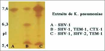 Pour en savoir plus: http://www.bioscience.org/1999/v4/e/bonomo/fulltext.htm 4 -3 - Parmi les autres paramètres biochimiques utiles à l'identification, la détermination de la masse moléculaire (25.000 - 35.000) n'a qu'un intérêt limité, de même que celui du point isoélectrique (pI). Ce dernier critère a été très utilisé, dans les années 70, en raison de sa faible variation pour les pénicillinases plasmidiques connues à l'époque (TEM-1, 5,4; TEM-2, 5,6, PIT-2/SHV-1 7,6-7,7...............). En revanche pour des raisons épidémiologiques ou lors de l'isolement d'un phénotype inhabituel, il était possible de rechercher rapidement à identifier le contenu "ß-lactamases" d'une ou plusieurs souches cliniques d'entérobactéries, par exemple. L'apport plus récent de l'identification génomique a limité l'impact de ces deux paramètres d'autant qu'ils peuvent être calculer indirectement dès l'obtention de la séquence peptidique. Exemple de variations de pI de diverses ß-lactamases (MAL-1, TEM-1, TEM-2, CTX-1, SHV-1......) révélées sur un gel de polyacrylamide par la méthode iodométrique Exemple de contenus "ß-lactamase" de souches cliniques de K. pneumoniae révélès sur un gel de polyacrylamide par la méthode chromogénique (nitrocéfine)