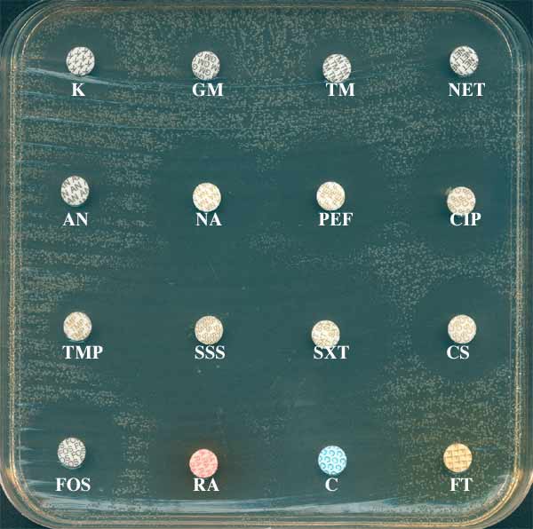 La souche a été testée par la méthode des disques sur le milieu de Mueller-Hinton à 37°C en atmosphère ambiante pendant 24 h.