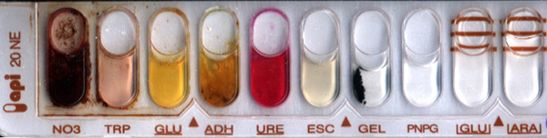 - Certains caractères d'identification de ce germe sont recherchés à l'aide d'une galerie d'identification biochimique API® 20NE comme ci-dessous pour les 10 premiers caractères après 48 h d'incubation à 37°C: